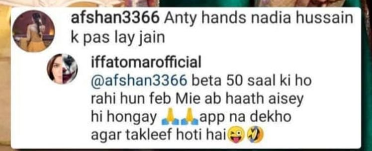 To which the Aangan star replied, “beta 50 ssal ki ho rahi hun Feb me ab haath aisey hi hongay, app na dekho agr takleef hoti hai.”