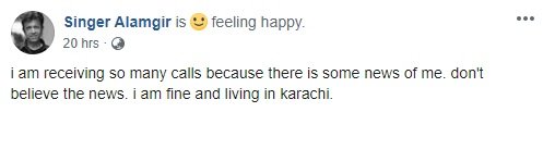 Renowned pop singer Alamgir has shut down rumours and reports of his death and clarified that he is doing fine in Karachi.
