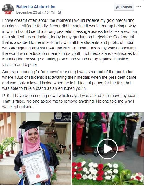 “As a woman, as a student, as an Indian, today in my graduation I reject the Gold medal that is awarded to me in solidarity with all the students and public of India who are fighting against CAA and NRC in India,” she wrote further.