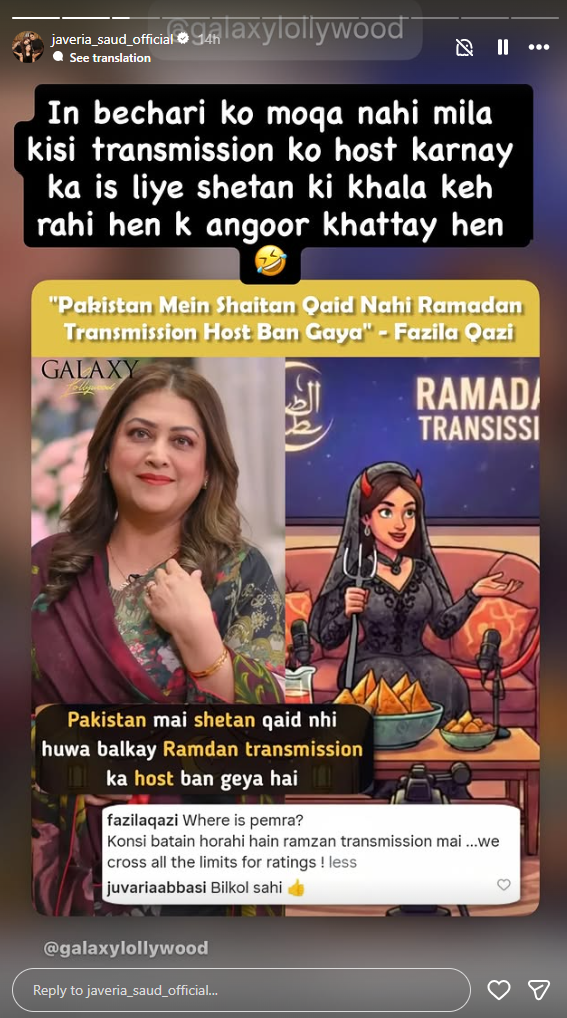 Javeria Saud did not stay silent and replied through her Instagram story, directly targeting Fazila Qazi’s remarks. “In bechari ko moqa ni mila kisi transmission ko host karnay ka is lie shetan ki khala keh rahi hen k angoor khattay hen."