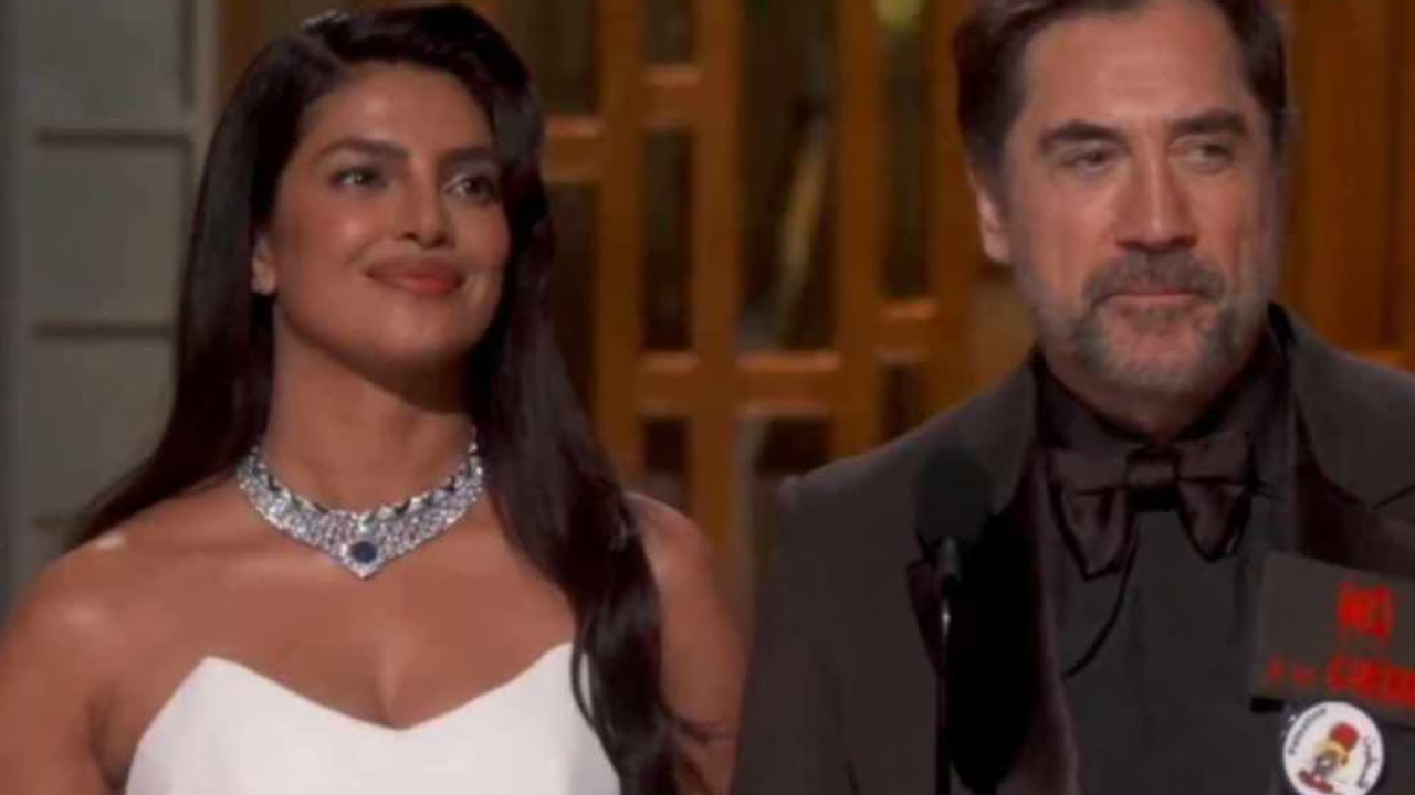 Standing beside him at the podium, Chopra appeared to smile and nod as Bardem passed the remark before the pair continued with the award presentation.