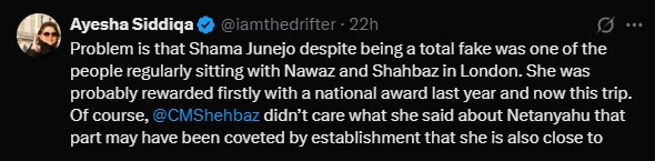 Author Ayesha Siddiqa opined, “[The] Problem is that Shama Junejo, despite being a total fake was one of the people regularly sitting with Nawaz and Shahbaz in London. She was probably rewarded firstly with a national award last year and now this trip. Of course, @CMShehbaz.”