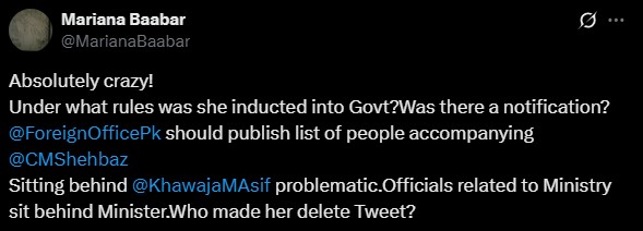 “Absolutely crazy! Under what rules was she inducted into Govt? Was there a notification? @ForeignOfficePk should publish list of people accompanying @CMShehbaz Sitting behind @KhawajaMAsif problematic. Officials related to [the] Ministry sit behind [the] Minister. Who made her delete Tweet?” asked veteran journalist Mariana Baber.