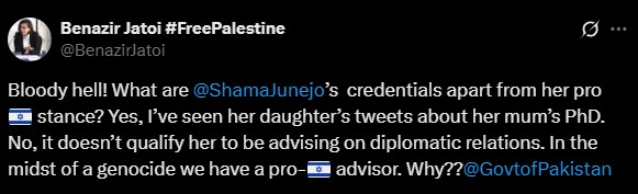 Lawyer Benazir Jatoi, while highlighting the paradox of the government's position on Israel, said, “Either @GovtofPakistan you stand with Palestine or you don’t. If you do, then why the hell did an intellectually low-level, Israel-apologist journalist @ShamaJunejo accompany you to the UNGA? Israel is committing a genocide as we type and you chose Shama at a time like this?!”