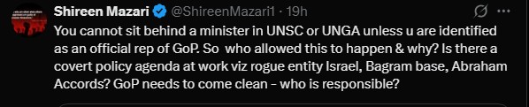 “You cannot sit behind a minister in UNSC or UNGA unless [you] are identified as an official rep of GoP. So who allowed this to happen & why? Is there a covert policy agenda at work viz rogue entity Israel, Bagram base, Abraham Accords? GoP needs to come clean - who is responsible?” asked former minister Shireen Mazari.