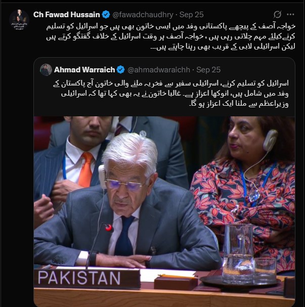 Former federal minister Fawad Chaudhry took to X to write that sitting behind the defence minister, “there is also a woman who has been running a campaign to recognise Israel. Khawaja Asif constantly speaks against Israel, but he also wants to stay close to the Israeli lobby.”
