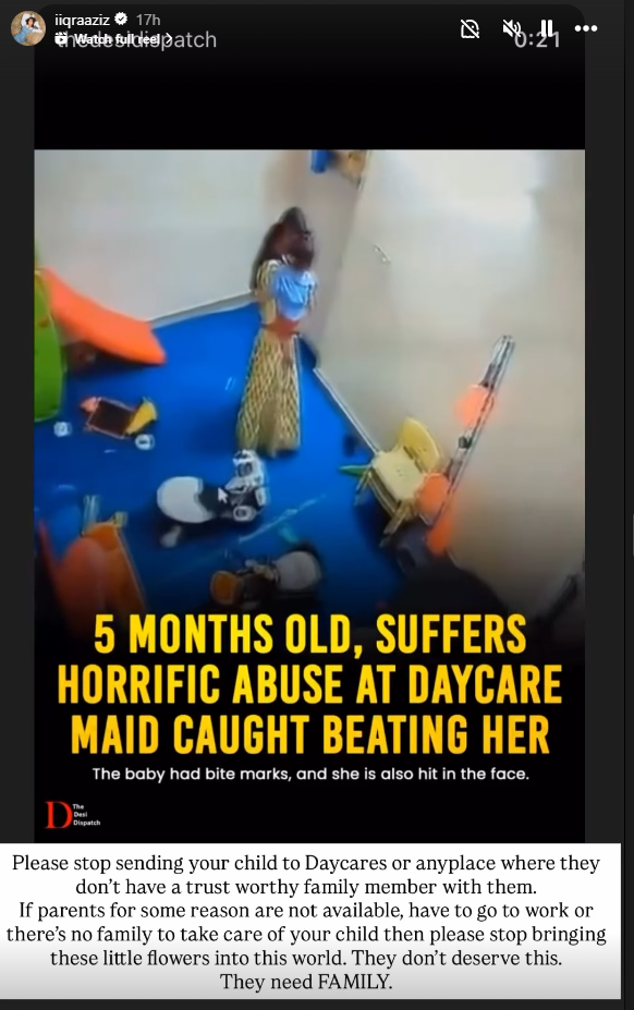 Taking to Instagram, Iqra posted a video message urging parents not to send their children to daycares unless a trustworthy family member is present. She wrote, "Please stop sending your child to daycares or any place where they don't have a trustworthy family member with them. If parents for some reason are not available, have to go to work or there's no family to take care of your child then please stop bringing these little flowers into this world. They don't deserve this. They need FAMILY."