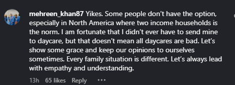 Some argued that her statement ignored economic realities. "Yikes. Some people don’t have the option, especially in North America where two-income households are the norm. I am fortunate that I didn’t ever have to send mine to daycare, but that doesn’t mean all daycares are bad. Let’s show some grace and keep our opinions to ourselves sometimes. Every family situation is different. Let’s always lead with empathy and understanding," one comment read.