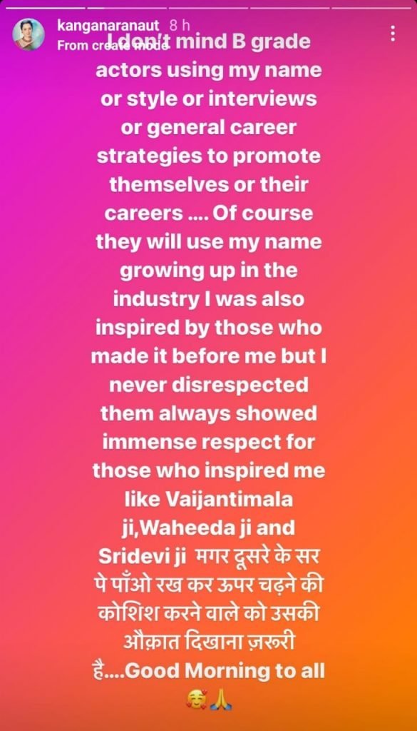In another post, The Queen actress further added: “I don’t mind B grade actors using my name or style or interviews or general career strategies to promote themselves or their careers. Of course, they will use my name growing up in the industry I was also inspired by those who made it before me but I never disrespected them always showed immense respect for those who inspired me like Vaijantimala ji, Waheeda Ji and Sridevi Ji. Magar doosre ke sar pe paon rakh kar upar chadhne ki koshish karne wale ko uski aukaat dikhana zaruri hai. Good Morning to all.”