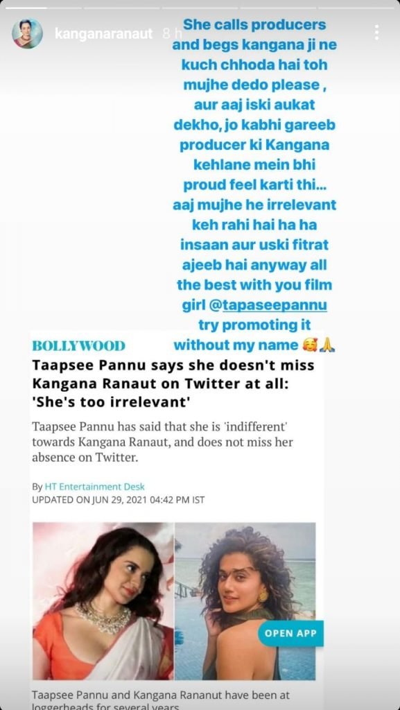 Kangana penned down a long note and said, “She calls producers and begs Kangana ji ne kuch chhoda hai toh mujhe dedo please, aur aaj iski aukat dekho, jo kabhi gareeb producer ki Kangana kehlane mein bhi proud feel karti thi… aaj mujhe he irrelevant keh rahi hai ha ha insaan aur uski fitrat ajeeb hai (she calls producers and begs them to give her films that I turned down, and look at her today. She was once proud to be called the Kangana for poor producers and today, she calls me irrelevant. Haha, people and their strange nature) anyway all the best with your film girl @tapaseepannu try promoting it without my name”.