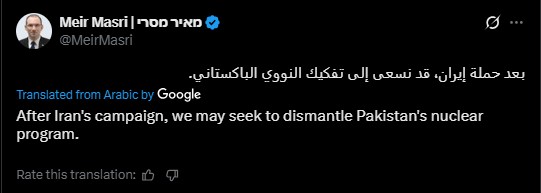 “After Iran's campaign, we may seek to dismantle Pakistan's nuclear programme,” Masri wrote in a post on X (formerly Twitter).