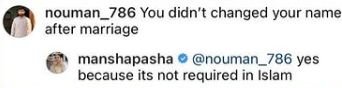 Recently, a fan made an observation about the Aangan star’s surname and asked under her comment section on Instagram that why she hasn’t changed her surname post marriage. To which Mansha answered: “Yes, because it is not it’s not required in Islam”.