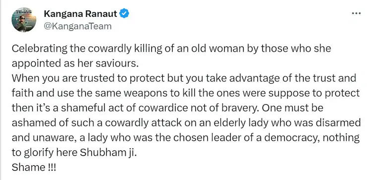 Taking to X (formerly Twitter) she wrote, “Celebrating the cowardly killing of an old woman by those who she appointed as her saviors. When you are trusted to protect but you take advantage of the trust and faith and use the same weapons to kill the ones were suppose to protect then it’s a shameful act of cowardice not of bravery. One must be ashamed of such a cowardly attack on an elderly lady who was disarmed and unaware, a lady who was the chosen leader of a democracy, nothing to glorify here Shubham ji. Shame !!! (Sic).”