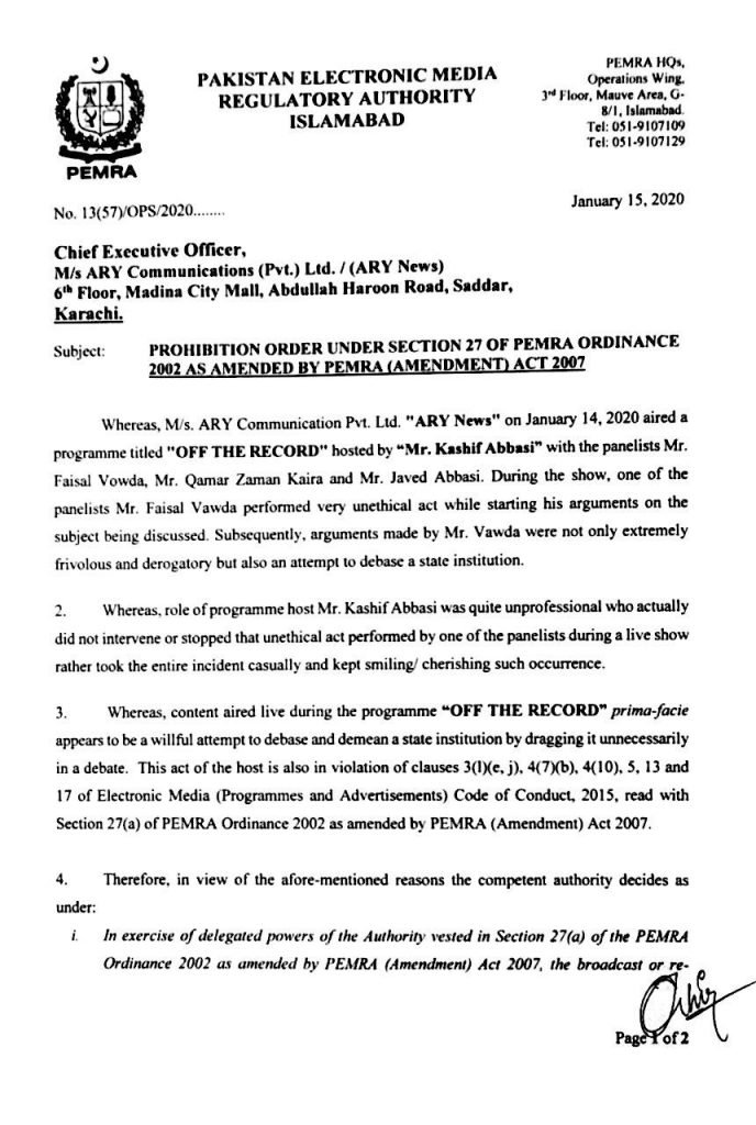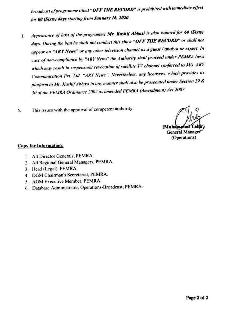 ARY News’ prime time anchor Kashif Abbasi has been banned from hosting his program and appearing on any other channel for 60 days by the Pakistan Electronic Media Regulatory Authority (PEMRA).