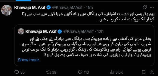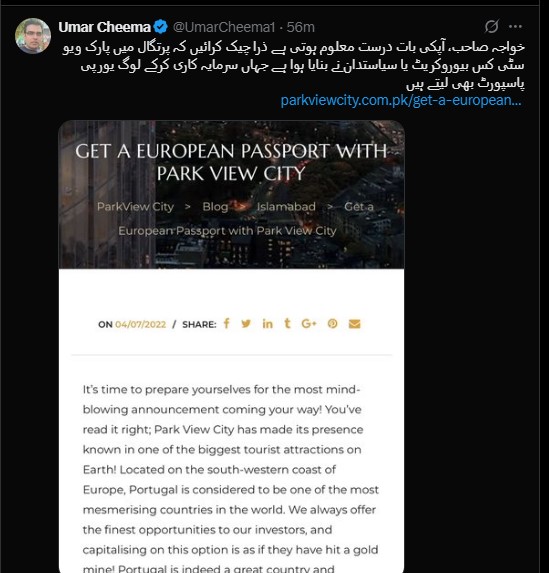 Journalists and social media users were quick to react to the minister’s allegations. “Khawaja sahab, your point seems valid. Please check who, among the bureaucrats or politicians, built Park View City in Portugal, where people obtain a European passport after investing there,” replied journalist Umar Cheema.