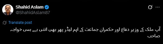 “You are the country's defence minister and a key leader of the ruling party, yet so helpless, Khawaja Sahib,” wrote journalist Shahid Aslam on X.