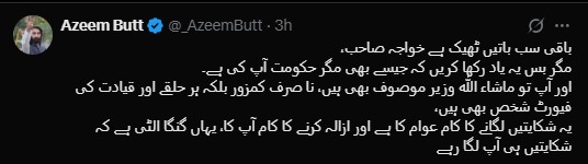 Another opined, “Everything else is fine, Khawaja Sahib, but just keep in mind that, no matter how, the government is yours. And you, by the grace of God, are also a respected minister, not only weak but also a favourite person of every constituency and leadership. It’s the public’s job to lodge complaints and yours to resolve them; here, the tables are turned, and you’re the one making complaints (sic).”