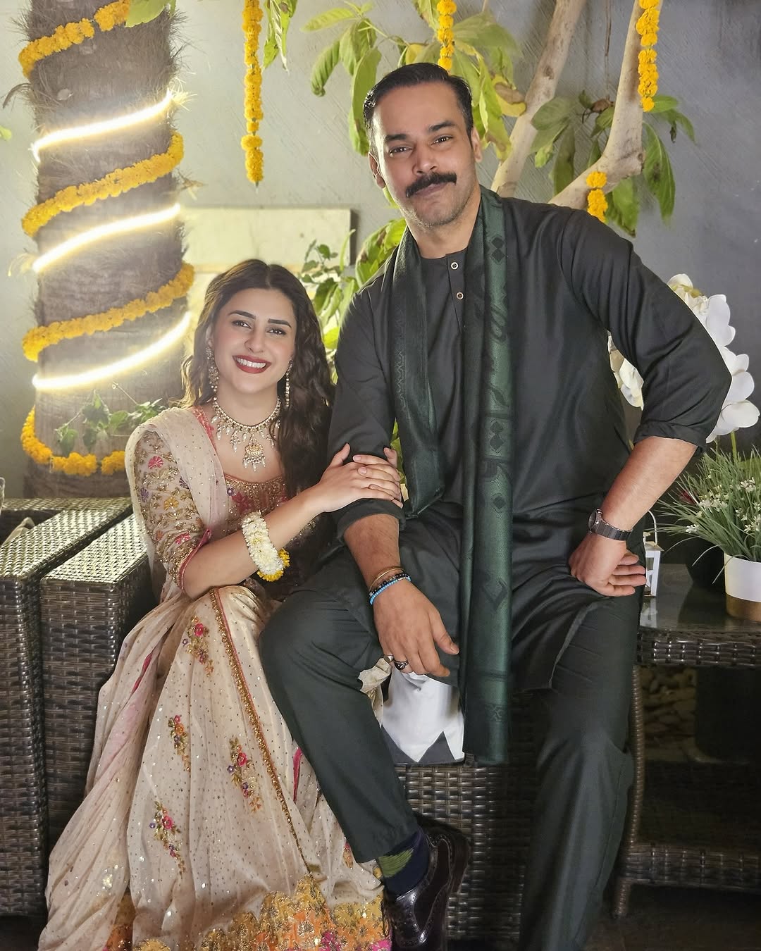 A decorative poster featuring the couple could be seen in the photos from the event, marking the beginning of their wedding celebrations. A number of industry colleagues of the two, including Shehzad Sheikh and Aashir Wajahat, were present at the celebration.