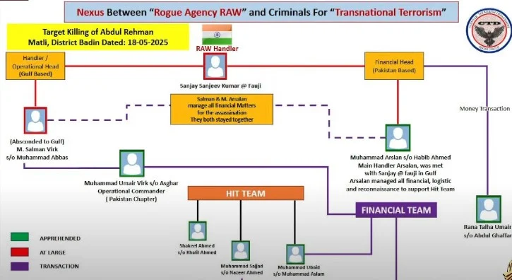 According to AIG Khan, before carrying out the killing, the suspects conducted reconnaissance for five days in Matli. CCTV footage and eyewitness accounts identified three of the apprehended men at the crime scene, adding that Indian media had celebrated the murder, which further underscored the involvement of RAW.