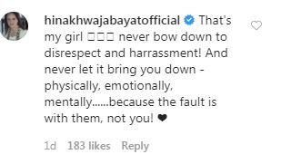 Senior actor Hina Bayat stepped forward in support of Mariyam, commenting, “Never let it bring you down…because the fault is with them, not you.”