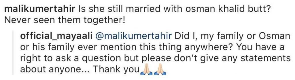 by Maya, an Instagram user commented, “Is she still married with Osman Khalid Butt? Never seen them together.”