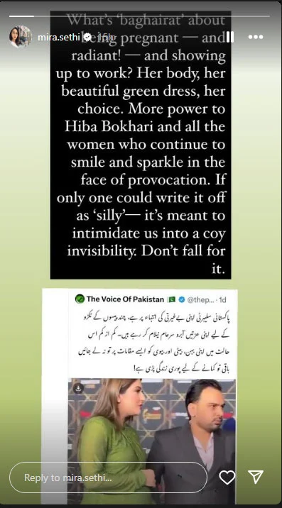 Mira Sethi shared a screenshot on her Instagram story where Hiba Bukhari was being criticized : “How is it disrespectful to be pregnant, look attractive, and work?”