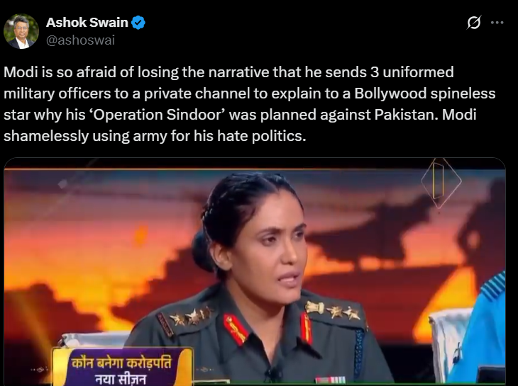 “Modi is so afraid of losing the narrative that he sends 3 uniformed military officers to a private channel to explain to a Bollywood spineless star why his ‘Operation Sindoor’ was planned against Pakistan. Modi shamelessly using army for his hate politic[s],” wrote Ashok Swai, a professor of peace and conflict research at Sweden’s Uppsala University.