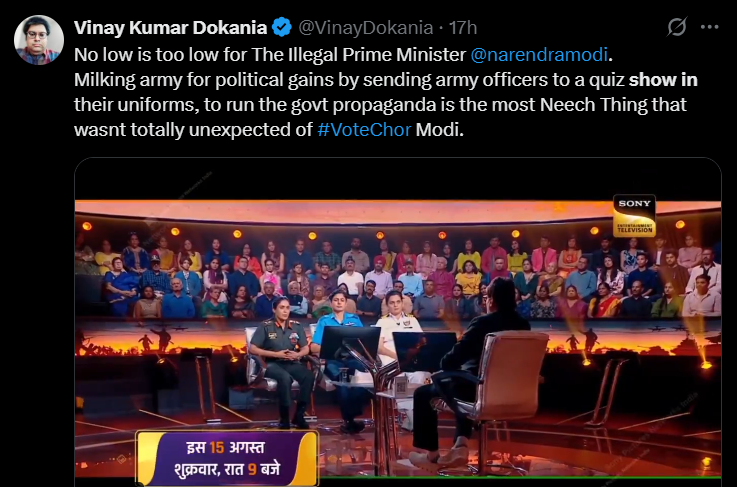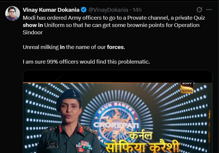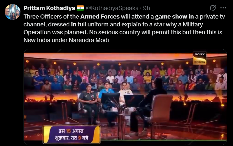 Another user said, “So Modi has ordered Army officers to go to a private channel, a private Quiz show in Uniform, so that he can get some brownie points for Operation Sindoor Unreal milking in the name of our forces. I am sure 99% officers would find this problematic [sic].”