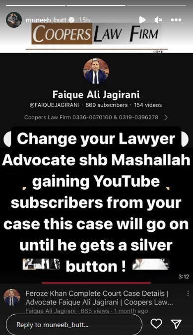 Butt also took a dig against Khan’s lawyer, Faique Ali Jagirani, by sharing a screenshot of his Youtube channel where the lawyer had uploaded details of the ongoing case between Khan and his ex-wife, Alizeh Sultan. In the caption, Butt criticized the lawyer for profiting off from the case for the sake of adding subscribers.