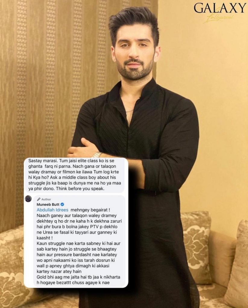 Muneeb Butt did not hold back while replying to a social media user who wrote a scathing comment on one of his posts on social media.