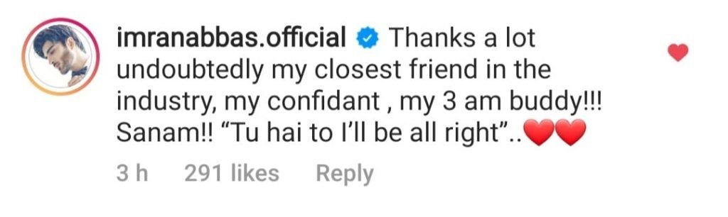 While thanking his Dil-e-Muztar co-star, Imran said: “Thanks a lot undoubtedly my closest friend of the industry, my confident, my 3 am buddy Sanam! ‘Tu hai to i’ll be all right’.”