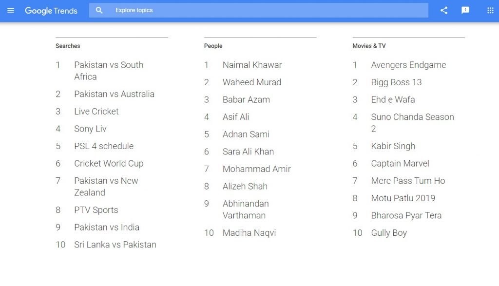 Google Trends has released the list of what was trending in year 2019 in Pakistan in the categories of Searches, People and Movies & TV.