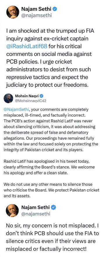 Najam Sethi stepped in to defend Latif and criticised the inquiry. “I am shocked at the trumped up FIA inquiry against ex cricket captain @iRashidLatif68 for his critical comments on social media against PCB policies,” Sethi wrote. “I urge cricket administrators to desist from such repressive tactics and expect the judiciary to protect our freedoms.”
