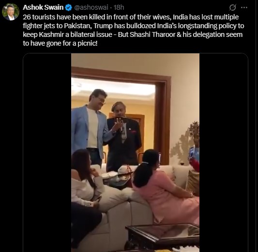 “26 tourists have been killed in front of their wives, India has lost multiple fighter jets to Pakistan, Trump has bulldozed India’s longstanding policy to keep Kashmir a bilateral issue - But Shashi Tharoor & his delegation seem to have gone for a picnic” wrote Ashok Swain, professor at Uppsala University in Sweden.