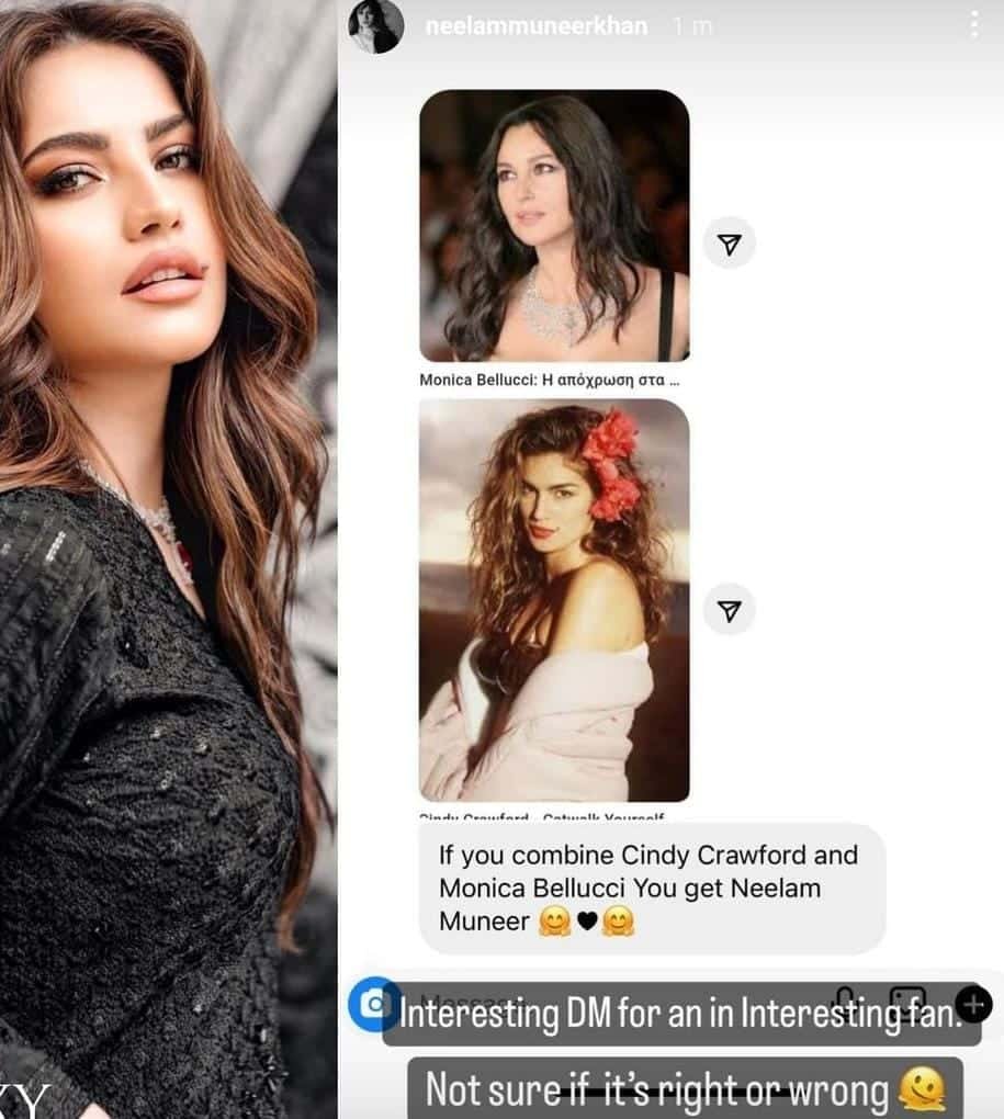Actor Neelam Muneer took to her Instagram stories to share a private message by a fan. The screenshot contains a netizen’s message in which he tells the Mere Meherbaan diva that her looks are a mixture of Hollywood actresses Monica Anna Maria Bellucci and Cindy Crawford.