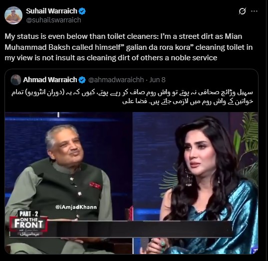 A day after the clip of the ex-actress’s statement about Warraich went viral, the latter responded with dignity. He took to X, writing, “My status is even below that of toilet cleaners. I am street dirt, as Mian Muhammad Baksh called himself ‘galian da rora kora’. Cleaning toilets in my view is not [an] insult as cleaning the filth left by others is a noble service.”