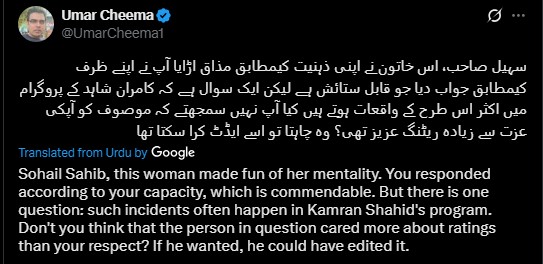 Cheema opined, “Such incidents often happen in Kamran Shahid's program. Don't you think that the person in question cares more about ratings than your respect? If he wanted, he could have edited it.”