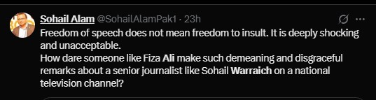 “Freedom of speech does not mean freedom to insult. It is deeply shocking and unacceptable. How dare someone like Fiza Ali make such demeaning and disgraceful remarks about a senior journalist like Sohail Warraich on a national television channel," another netizen asked.