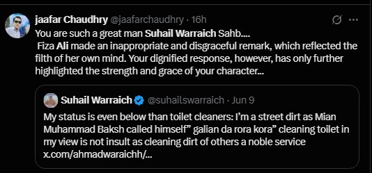 Calling Warraich “a great man” one person said, “You are such a great man Suhail Warraich Sahb.... Fiza Ali made an inappropriate and disgraceful remark, which reflected the filth of her own mind.”