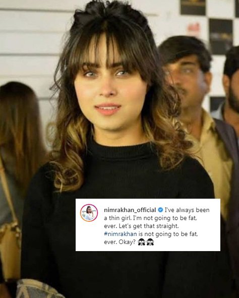 , Nimra wrote, “I’ve always been a thin girl. I’m not going to be fat, ever. Let’s get that straight. Nimra Khan is not going to be fat, ever. Okay?”