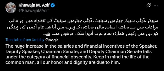Defence Minister Khawaja Asif on Wednesday evening excoriated the approval of a fivefold increase in the salaries and perks of the speaker of the National Assembly (NA) and chairman of the Senate, calling it “financial obscenity”.