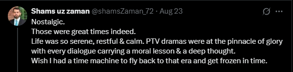 Many users expressed their admiration for the way old dramas like Parosi reflected cultural values, taught moral lessons, and left a lasting emotional impact. “Life was so serene and restful. PTV dramas were at the pinnacle of glory. Every dialogue carried a deep thought,” one viewer wrote, reminiscing about a bygone era.