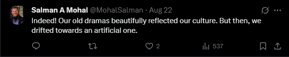 Social media users are showering praise on the drama's writing, acting, and direction, calling it a true representation of meaningful storytelling that once defined Pakistani television. “Writers, actors, directors... it was wholesome all round,” one user commented. Another added, “These were real dramas; what we see today is complete trash.”