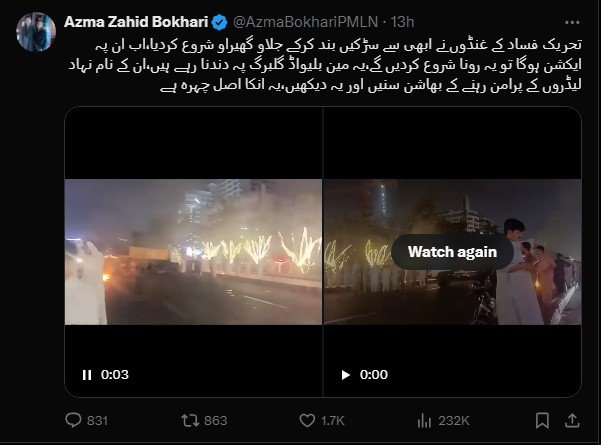 Punjab’s Information Minister Azma Bokhari also shared videos on X (formerly Twitter) calling out “Tehreek-e-Fisad” (movement of chaos).