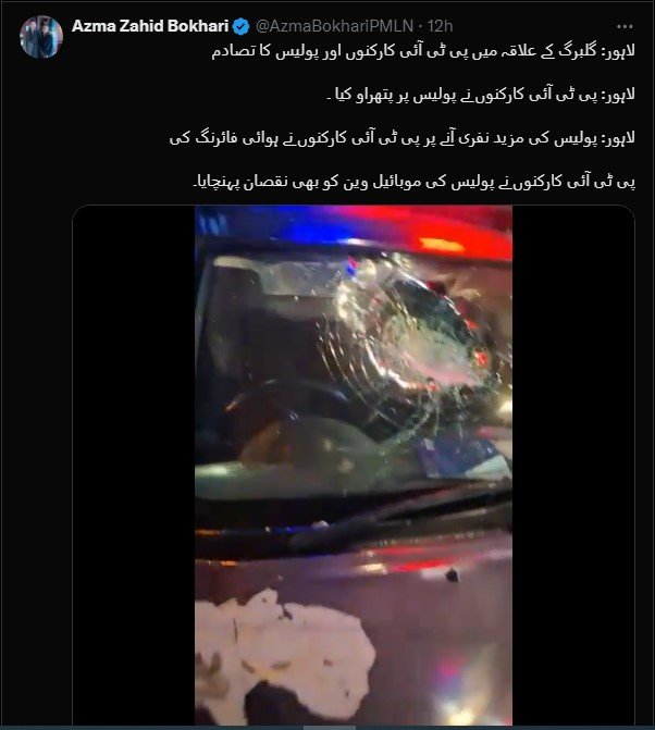 Taking a jibe at PTI’s leadership, who are repeatedly asking people to stay peaceful, Azma shared several videos on social media captioning that these people are rooming around Main Boulevard Gulbarg in Lahore, “Listen to the peaceful speeches of their so-called leaders while actually this is their real face.”