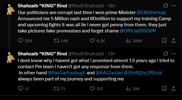 In a series of posts on X (formerly Twitter), the three-time national Wushu champion said Prime Minister Shehbaz Sharif had announced a reward of PKR 5 million in cash and PKR 80 million to support his training and upcoming fights. However, the promises were never fulfilled.