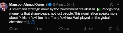 “A smart and strategic move by the Government of Pakistan. Recognizing moments that shape peace, not just people. This nomination speaks more about Pakistan’s vision than Trump’s virtue. Well played on the global chessboard,” a user wrote on X.