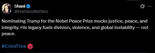 Others expressed displeasure with the government’s decision. One person opined, “Nominating Trump for the Nobel Peace Prize mocks justice, peace, and integrity. His legacy fuels division, violence, and global instability — not peace.”