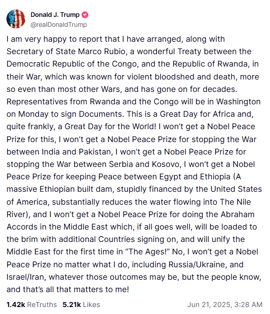 “I won’t get a Nobel Peace Prize for this. I won’t get a Nobel Peace Prize for stopping the war between India and Pakistan. I won’t get a Nobel Peace Prize for stopping the war between Serbia and Kosovo. I won’t get a Nobel Peace Prize for keeping peace between Egypt and Ethiopia, and I won’t get a Nobel Peace Prize for doing the Abraham Accords in the Middle East… I won’t get a Nobel Peace Prize, no matter what I do,” reads Trump’s post.