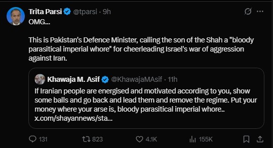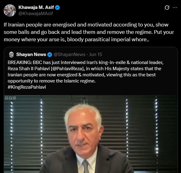 Author and activist Trita Parsi expressed awe for Asif's post for not mincing his words. “OMG… This is Pakistan's defense minister, calling the son of the Shah a ‘bloody parasitical imperial wh*re’ for cheerleading Israel's war of aggression against Iran,” Parsi wrote.